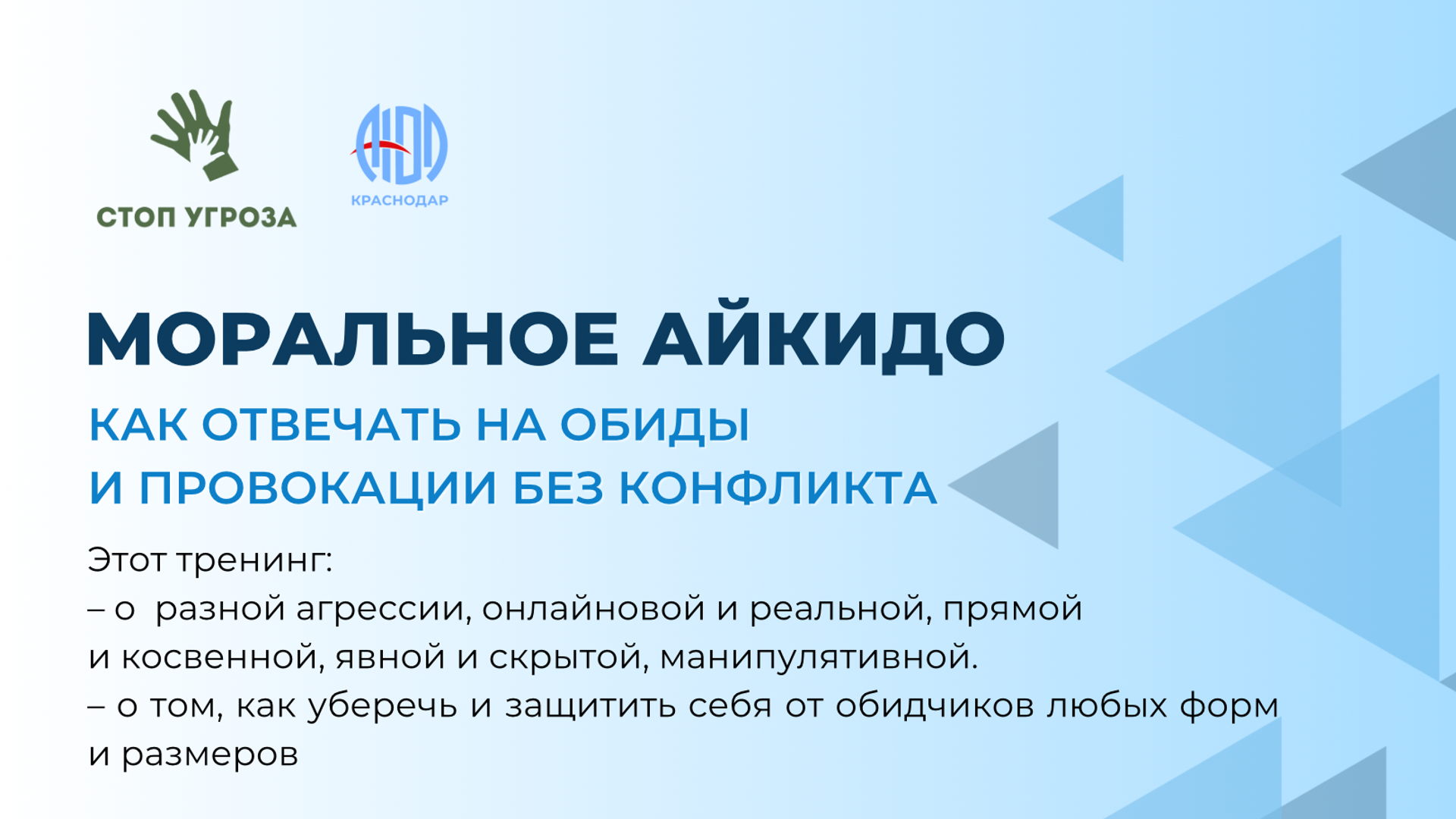 Бесполезно говорить агрессору, что он поступает плохо. Бесполезно говорить жертве, что она должена быть сильнее или умнее, уметь защищать себя или игнорировать негатив. Это не работает. А что работает, узнаете на тренинге.